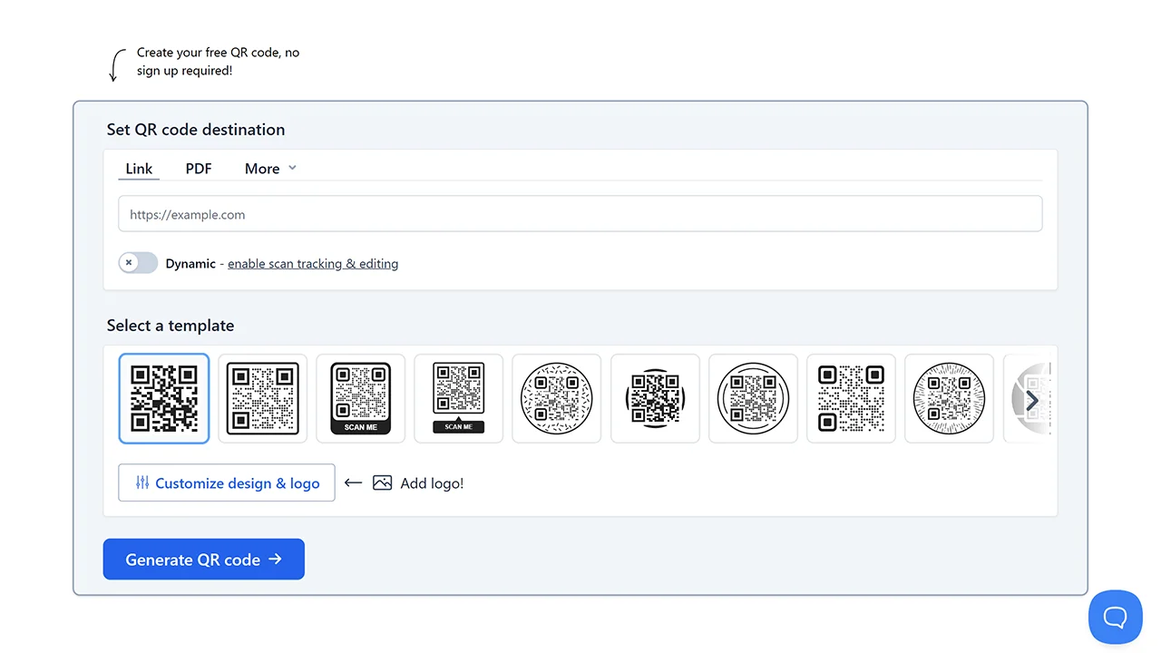 HoverCode specializes in dynamic QR codes with editing and analytics, allowing quick creation for URLs, PDFs, vCards, WiFi, app stores, and more. While basic static generation is promoted as “no signup required,” full access to saves, edits, and tracking needs a free account. It’s best for campaigns needing post-print updates rather than one-off anonymous use.
