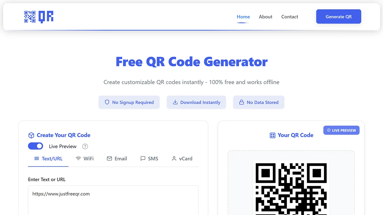 JustFreeQR offers a straightforward experience for generating QR codes for links, text, and contact information. The tool emphasizes accessibility and ease of use across devices. It is well suited for users who want a dependable generator without design complexity or hidden restrictions.