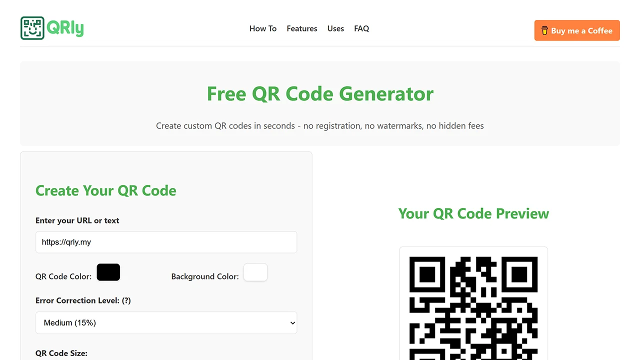 QRly emphasizes speed and simplicity, enabling users to generate QR codes for URLs and basic content within seconds. It works best for quick sharing or short-term use cases where efficiency is more important than customization. The interface remains clean and straightforward, without unnecessary steps or signup prompts.