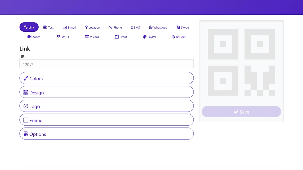 - 20+ data types, including URL, vCard, Wi-Fi, email, SMS, PayPal, and event details.