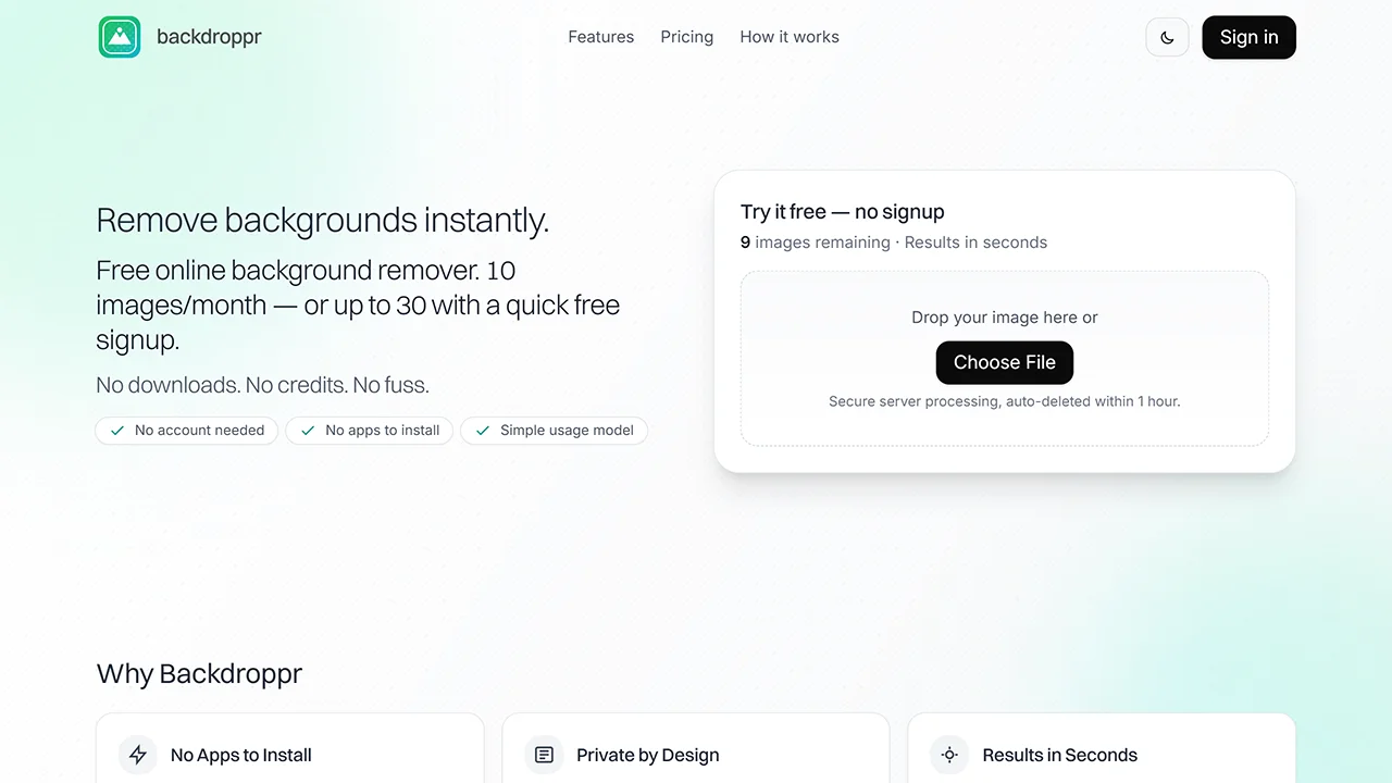 Backdroppr is a lightweight, browser-based background remover focused on speed and simplicity. It allows users to upload an image, remove the background automatically, and download the result without creating an account. The tool is best suited for quick edits where standard resolution output is sufficient, such as social media visuals or simple design assets.