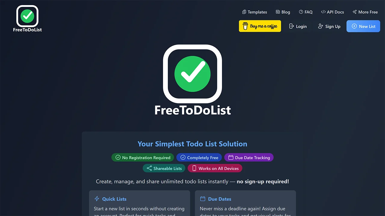 FreeToDoList is a clean, instant-access to-do list tool that lets you create unlimited task lists, set due dates with visual overdue alerts, reorder items via drag-and-drop, and sort by priority or status – all without any signup. Share read-only lists easily with family, colleagues, or clients through simple links, while enjoying mobile-friendly access across devices and optional RSS feeds for updates, delivering straightforward task management and collaboration with maximum simplicity and privacy.