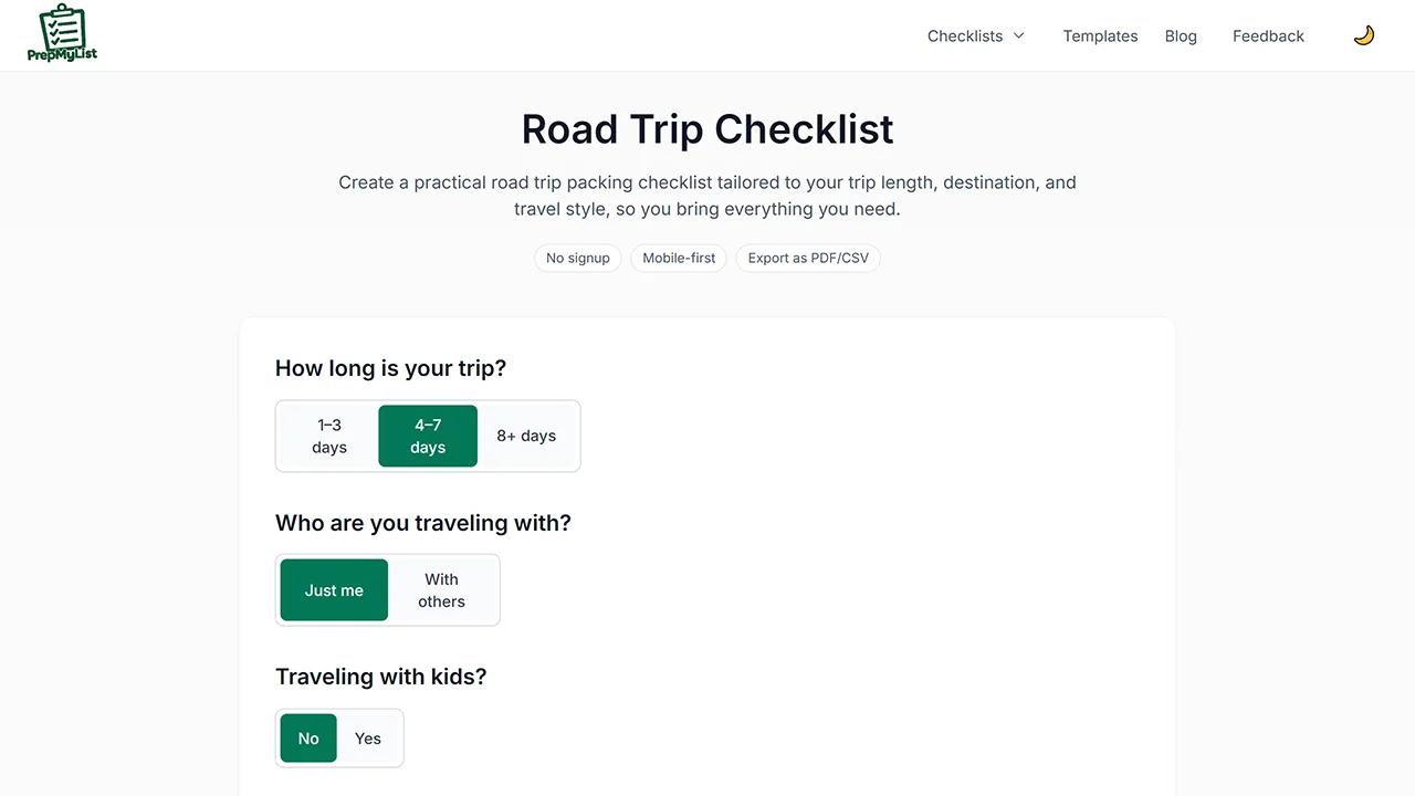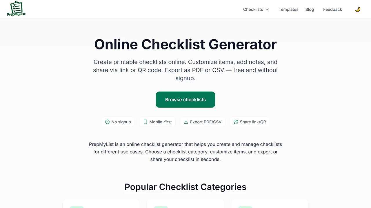 PrepMyList is a user-friendly online tool that lets you generate and manage checklists without any signup, perfect for tasks like road trips or maintenance. Key features include guided setups, item customization, note-adding, and sharing via links or QR codes, all saved locally in your browser for quick access and privacy.