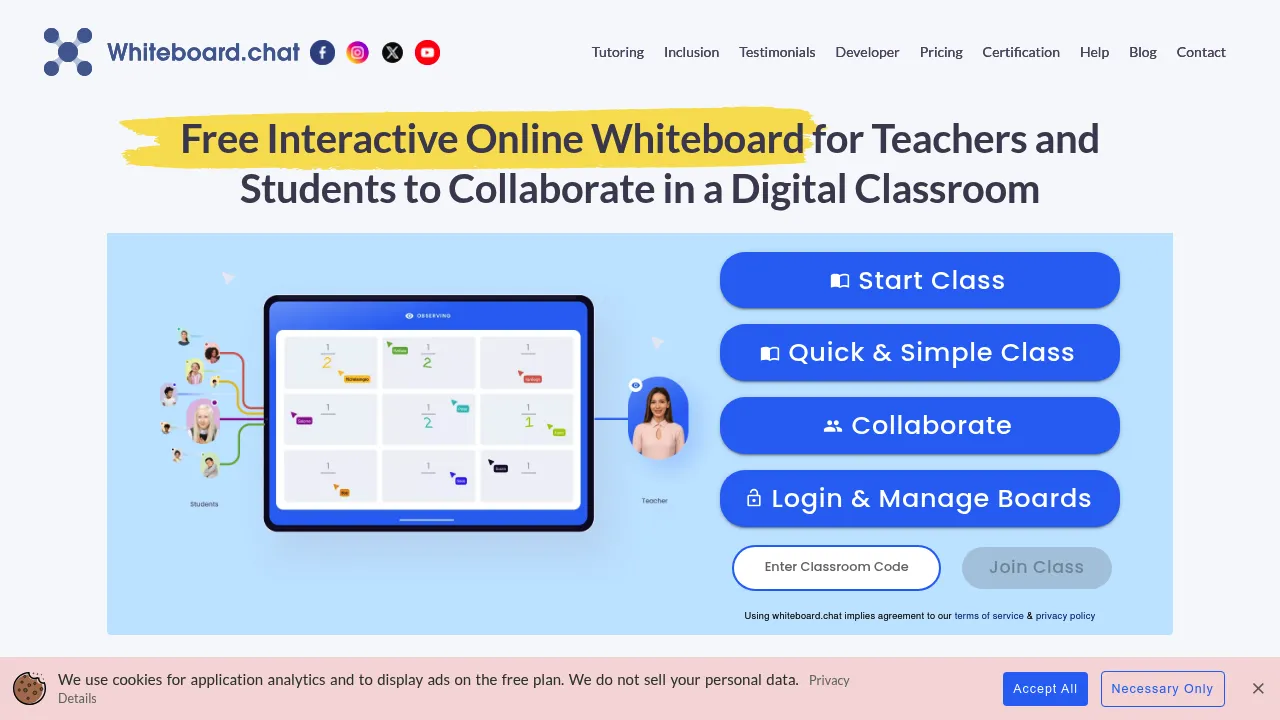 Whiteboard.chat provides a free, no-signup-required interactive online whiteboard tailored for teachers and students, enabling instant creation of engaging digital lessons. Teachers can monitor student work in real time, offer one-on-one feedback, auto-assign breakout groups, and access a vast library of active widgets, gizmos, and manipulatives, plus AI engagement tracking, speech-to-text, and handwriting recognition. It delivers privacy-focused, device-agnostic collaboration that enhances teaching without any barriers or installations.